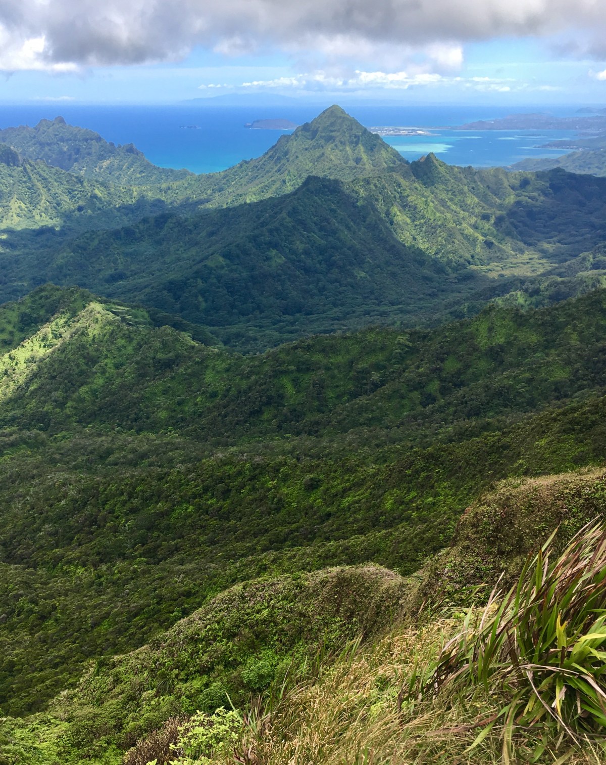 Alan climbed up the rocky outcrop that had a view of the point. Haha, we all could have gone around the back of the rock to get to the top. That’s what happens when you are looking at the beautiful pacific ocean instead of the mountains. Once it was built, he added a ti leave lei and I added some ashes, thought it would be nice place for Oat. The view from the top of the rock was of the point and the pacific ocean.