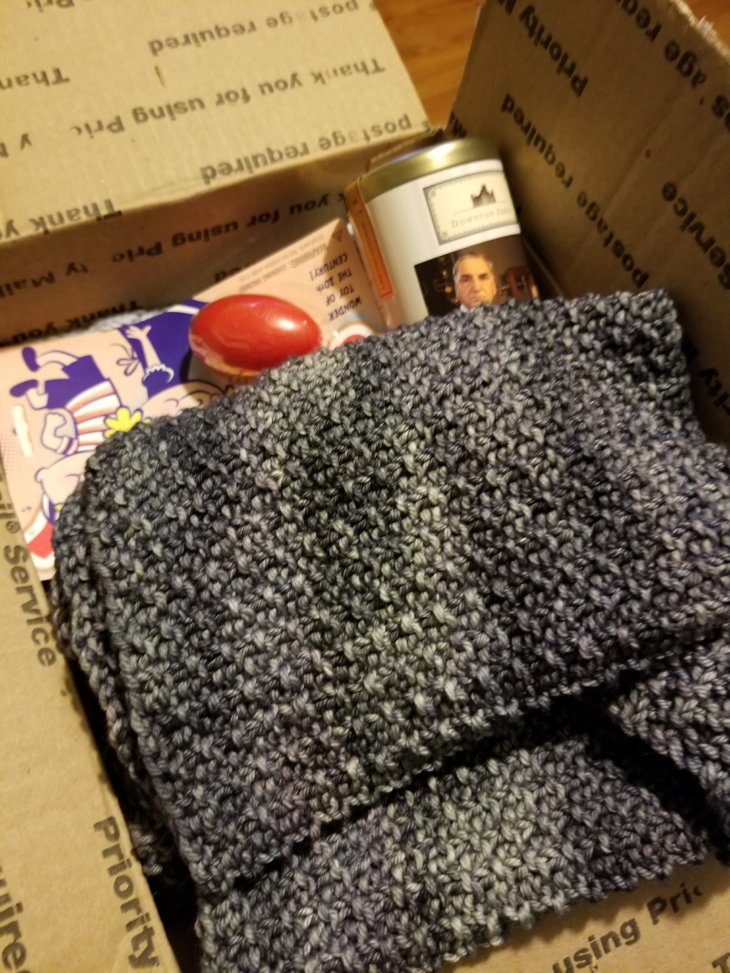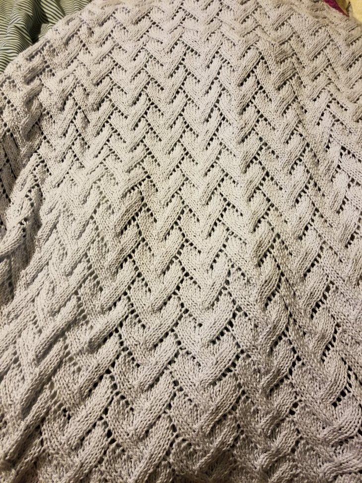 I’m going to knit night tonight and I’m delivering my sister’s lap blanket, Martha’s (the fastest knitter I know, even faster than my sister) mom’s scarf and my chunky gray lap blanket for donations. The first of Oat’s knit-a-long items.