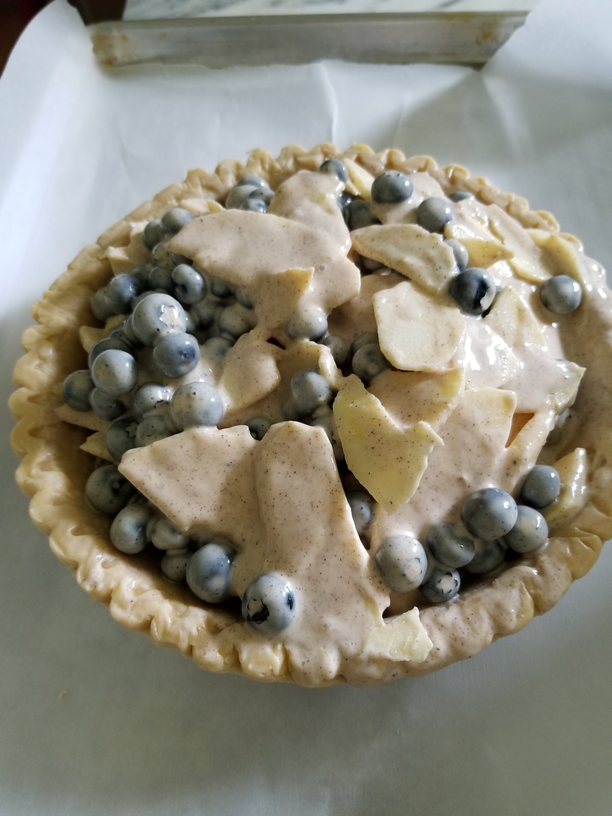 It all started with apples. I bought them to make apple bread pudding for some friends. That didn’t happen. Then I found some nice looking organic blueberries. I’ve been making a blueberry custard pie, which everyone loves. So I thought maybe I can combine the apples and blueberries with the custard filling and crumb top.