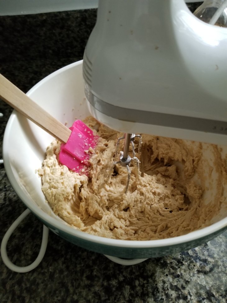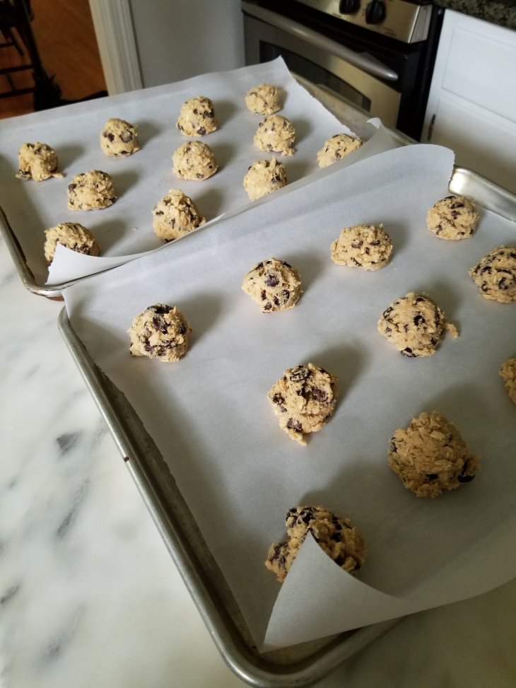 Their middles may still look a tiny bit shiny = chewy center. So this was the recipe. I remembered to take out the butter so creaming the butter and sugars was quick. 1/2 cup less of chocolate chips and my handy scooper to make the cookies equal size and even.