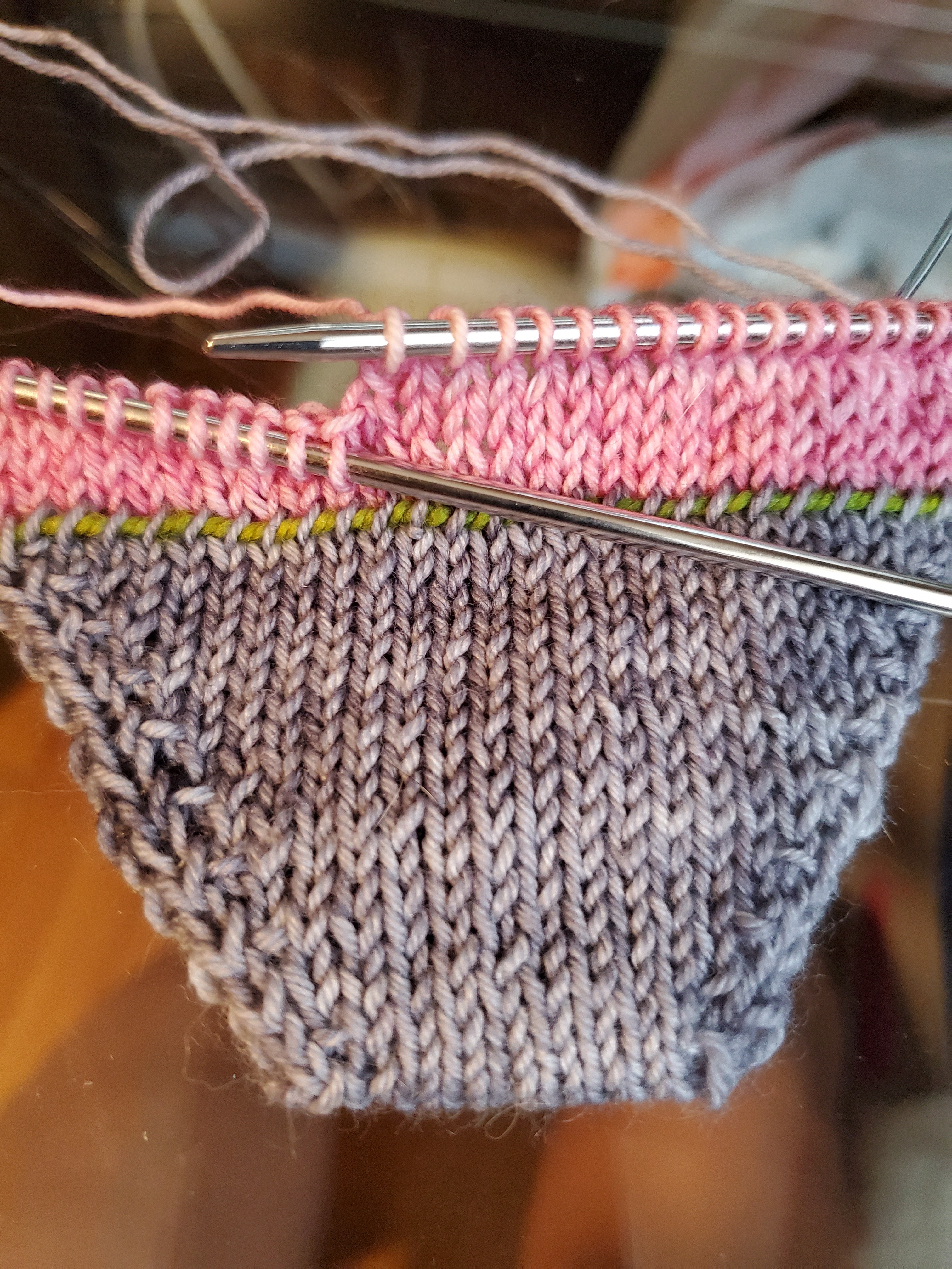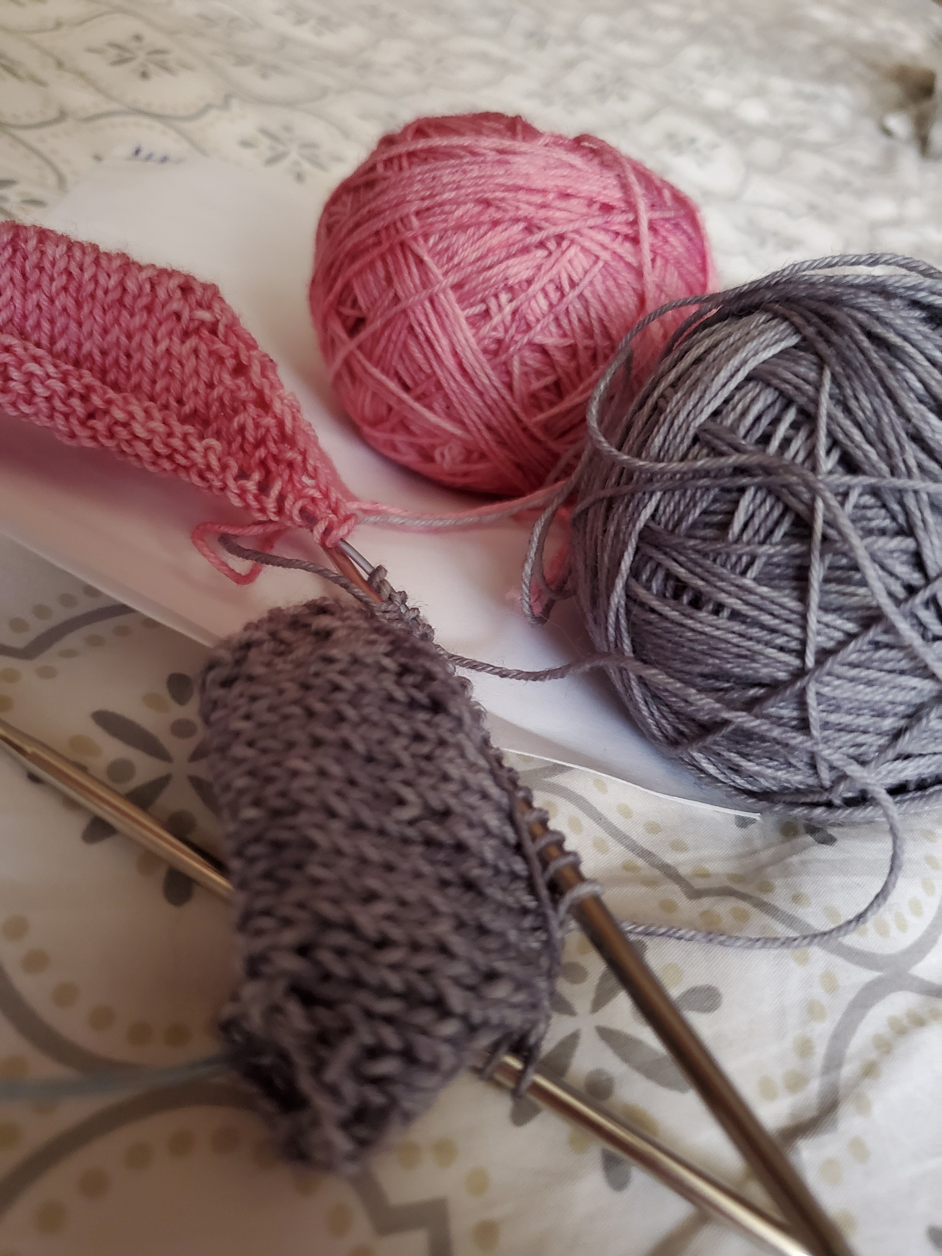 I decided to use the gray and pink super wash from my Saver’s run to make a pair hiking socks for my trip at the end of September. I found a simple sock pattern I wouldn’t give up in the middle of the sock, Trusty toe up sock by Tanis Lavellee.