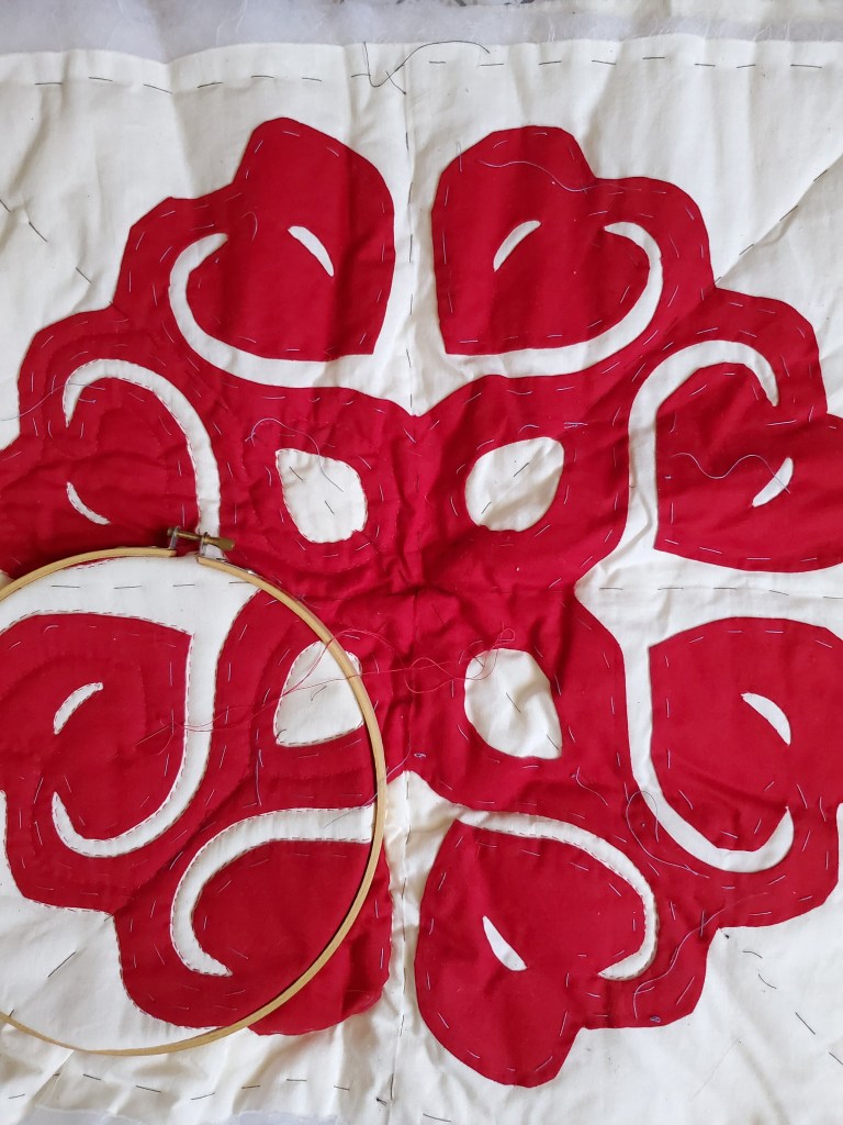 My Hawaiian quilt project with instruction from quilting master Kay from my knitting group. It’s sadly sitting in my quilting back waiting to be picked up again. Weather has turned hot and I haven’t been to the monthly quilting bee (no ac). I have a couple of other projects in my queue that have higher priority so I’ll wait till the weather turns a little cooler or finish the higher queued projects to pick these up again.
