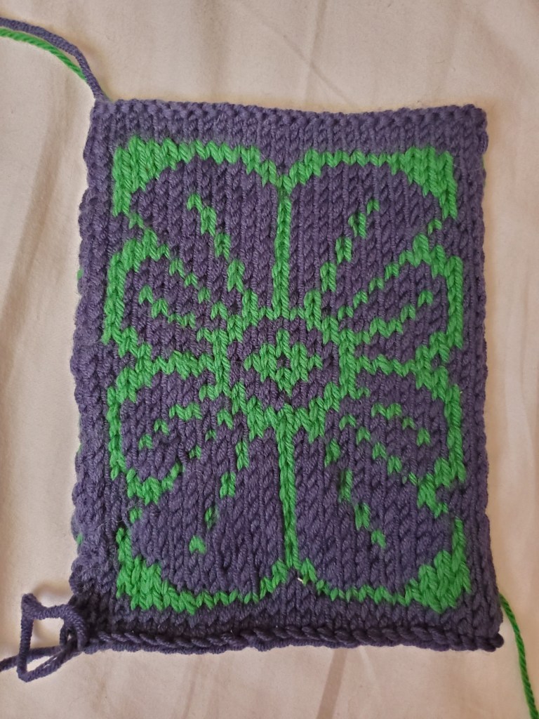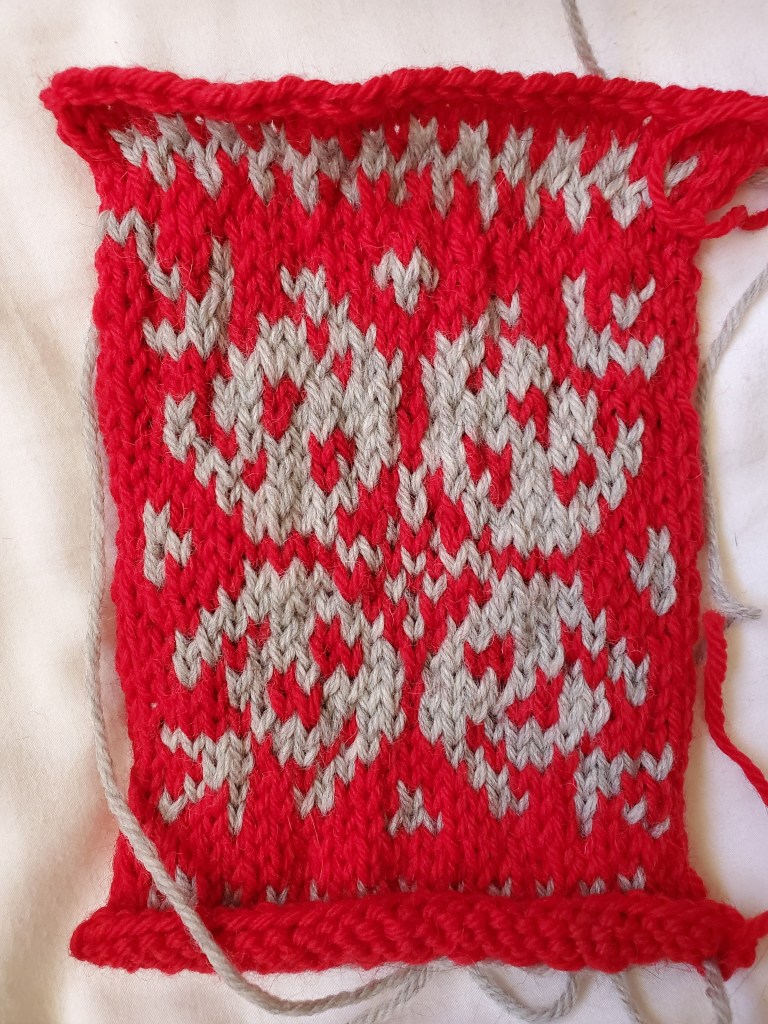 I started this at the beginning of this project at the beginning of the quarantine. It’s the Arne and Carlos Quarantine Knit-a-long. Arne and Carlos are Norwegian knitwear designers that have a podcast. It’s a project color work project of different square designs.