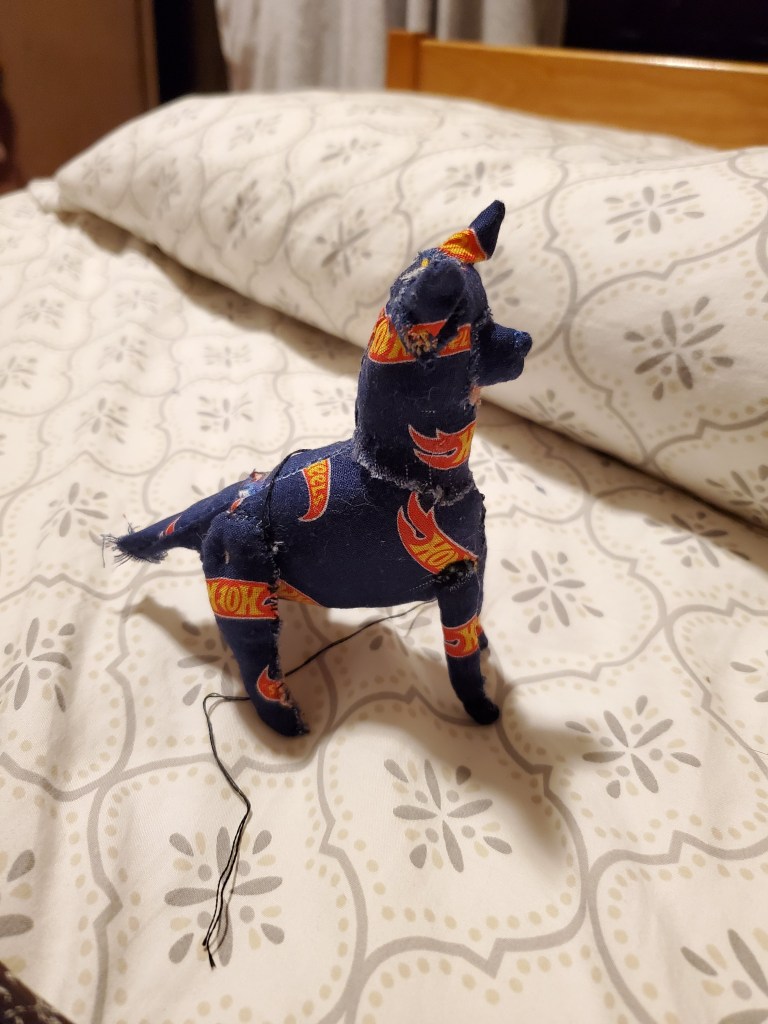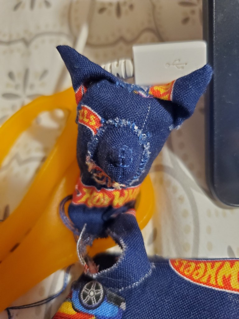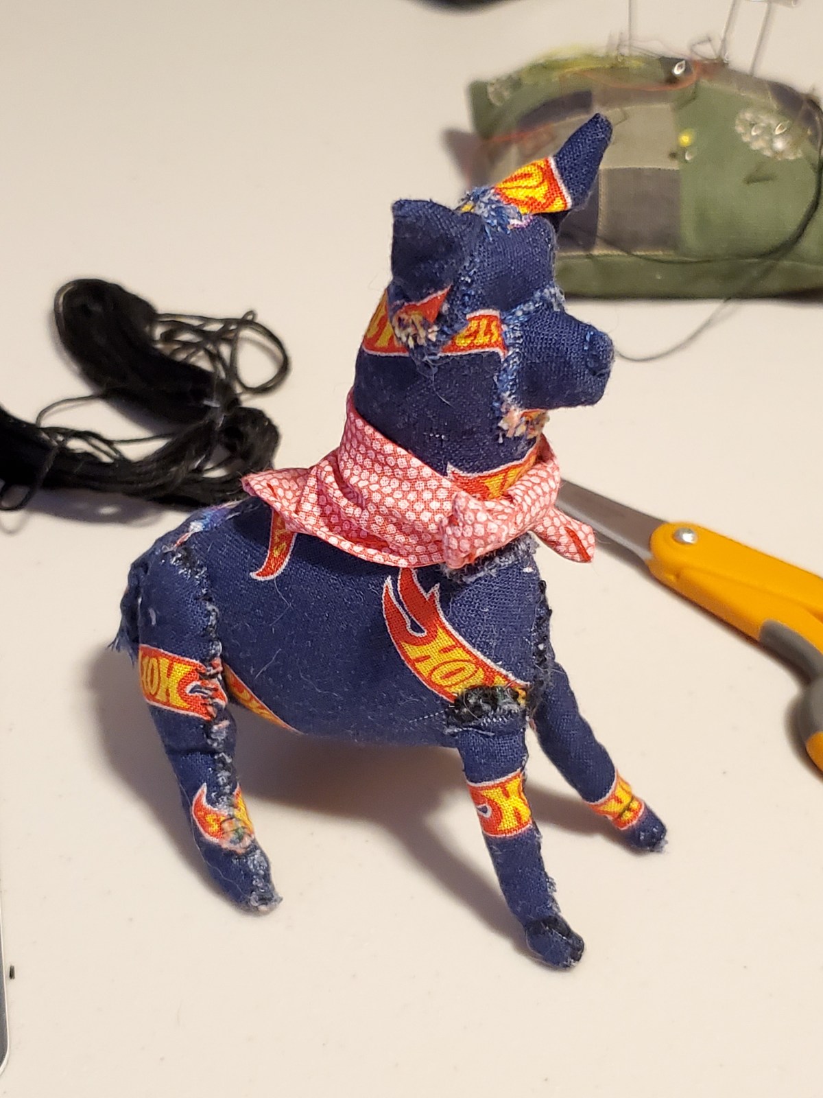 This happy accident turned into a Christmas day project I finished up on Boxing day. Mom and Dad thought it was funny and cute. Now “Hot Wheels” the dog sits on the dining room table to keep them company.
