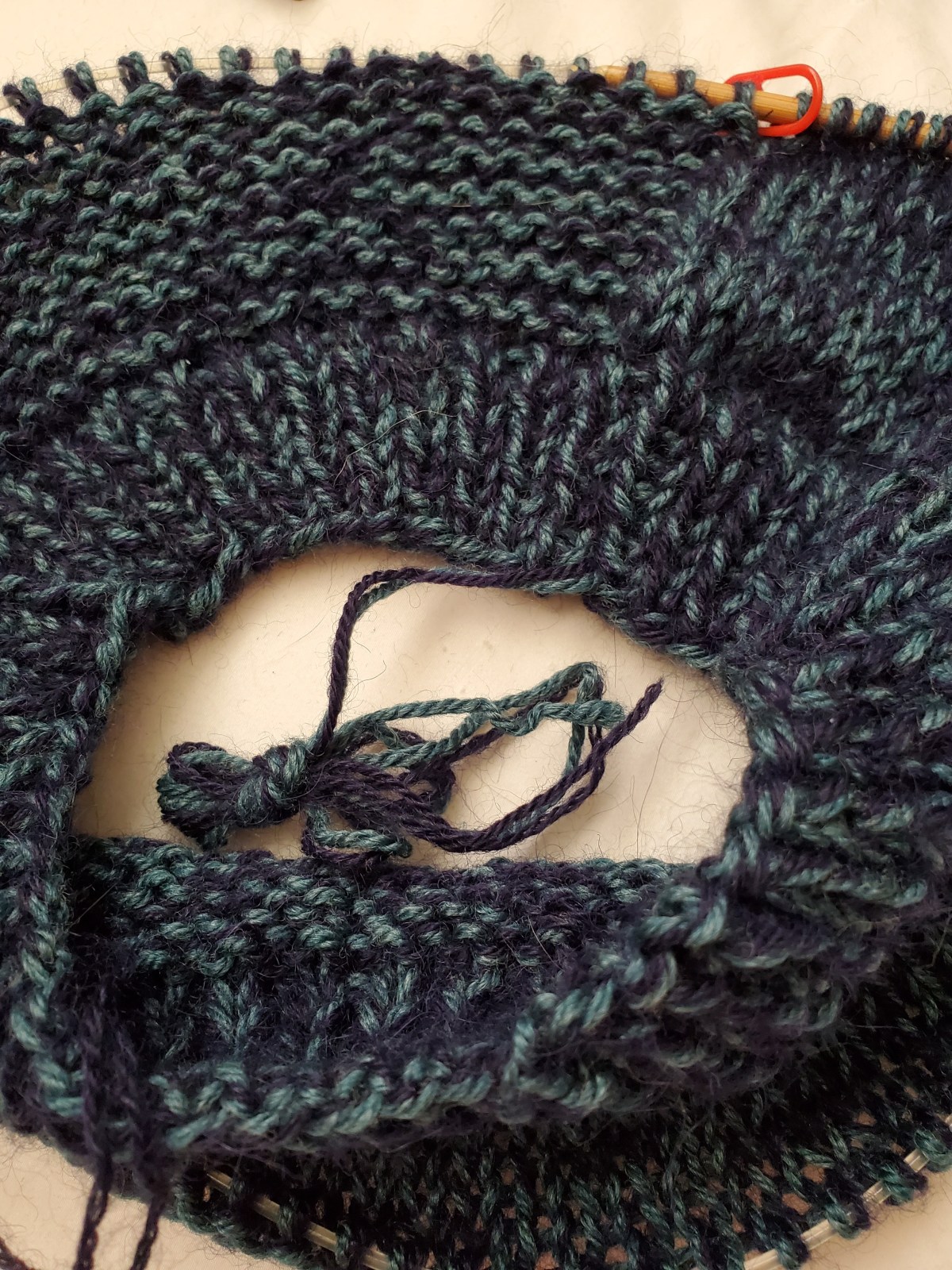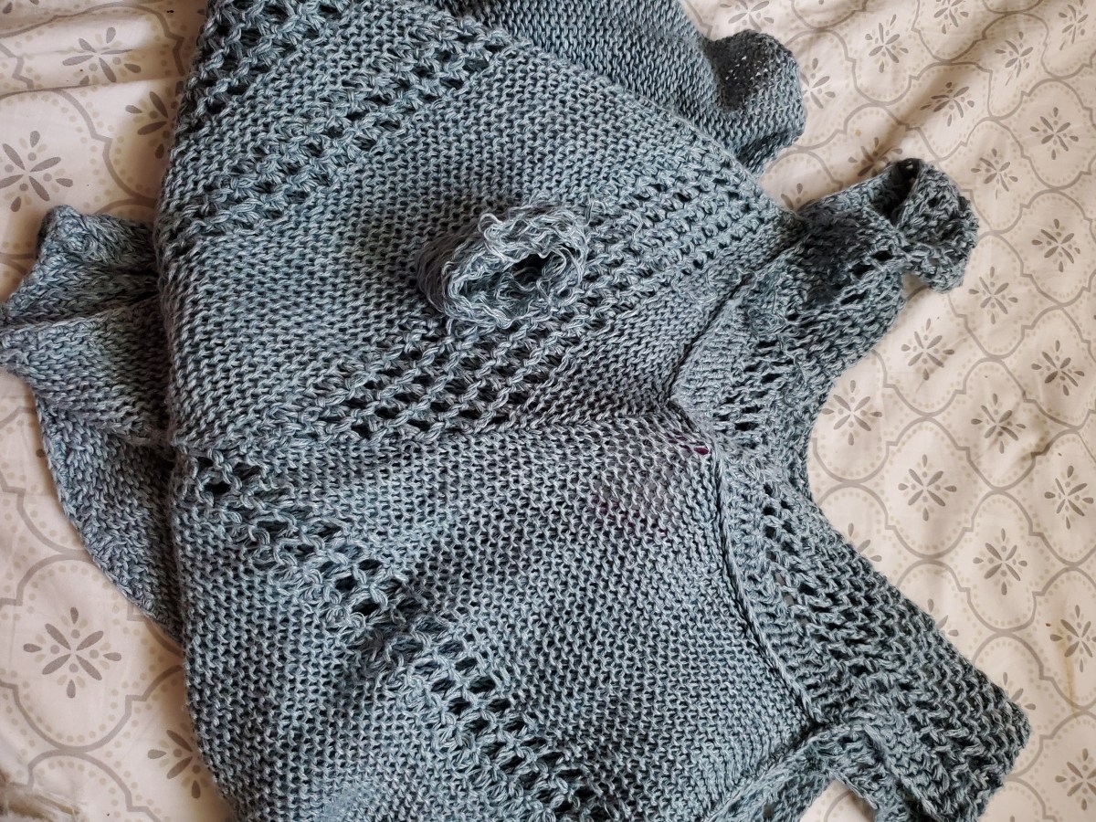 I went out thrifting on President’s day, looking for fabric and yarn for my inventory for my Etsy shop (opening in March). Yarn selection was a bust, just a bunch of bland acrylic yarn. But in my roaming for a good deal, I spied a knitted top hanging at the end of the ladies dresses.