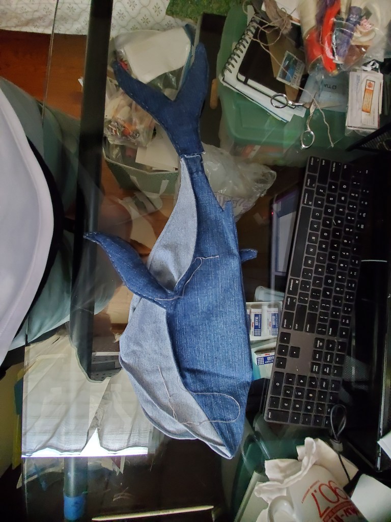 The lined pieces were lighter than the denim, so I decided to use the machine on the larger sections of the whale. I added top-stitched the underbody where the pleats should be, then stitched the underbody together. I handstitched the fins and tail together to keep the points sharp, lay flat, and added top-stitching.