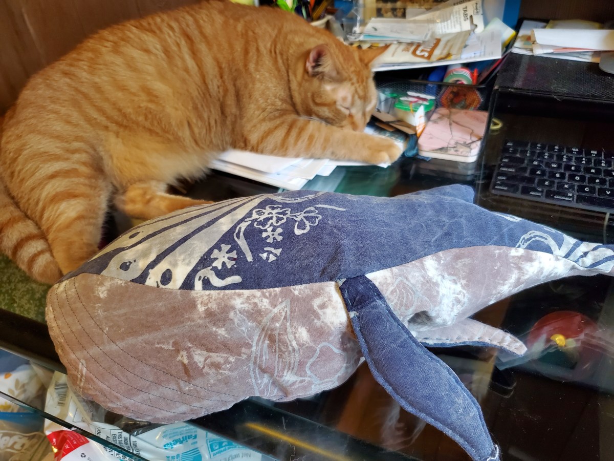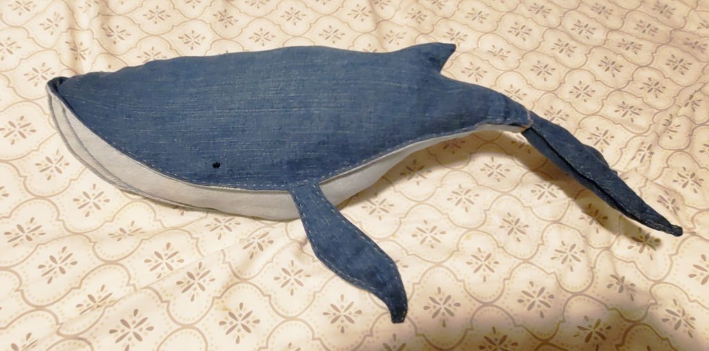 Wow! I liked the look of the finished product. I decided to do another whale because I had enough fabric. I made a few adjustments to the pattern to help the points of the tail and fins lay better. I also decided to try eliminating the pleats on the belly and machine-stitched the underbody instead. And for Whale #2, I hand-stitched the entire whale except for the top-stitching on the underbody.