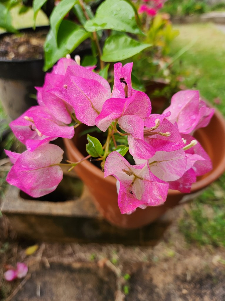 Top row, left to right: my pakalana is coming back; now there are clusters of flowers amongst the vines; the air plant has a reddish glow with orange-red blooms; the pakalana has a seed pod; pink and white bougainvillea from a plant that I trimmed back hard this winter.