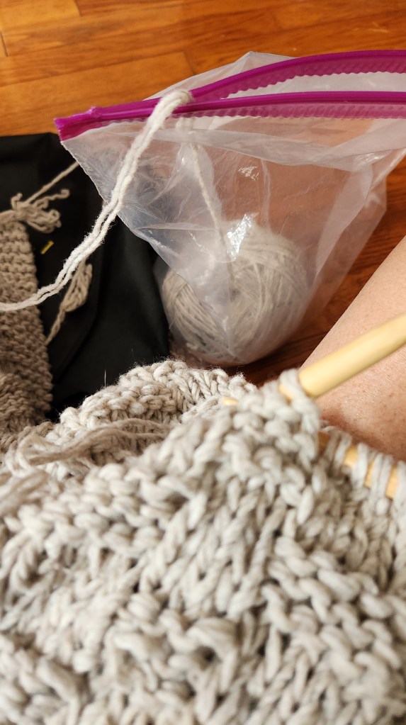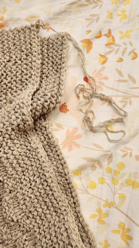 It went quicker than I thought. I bought a Japanese floor chair (no legs, seat cushion with a back) to sit on in front of my monitor to watch my shows as I knitted. It took a little over two weeks to finished. There was a bit of yarn chicken at the end. But I won with about 12″ of yarn to spare.