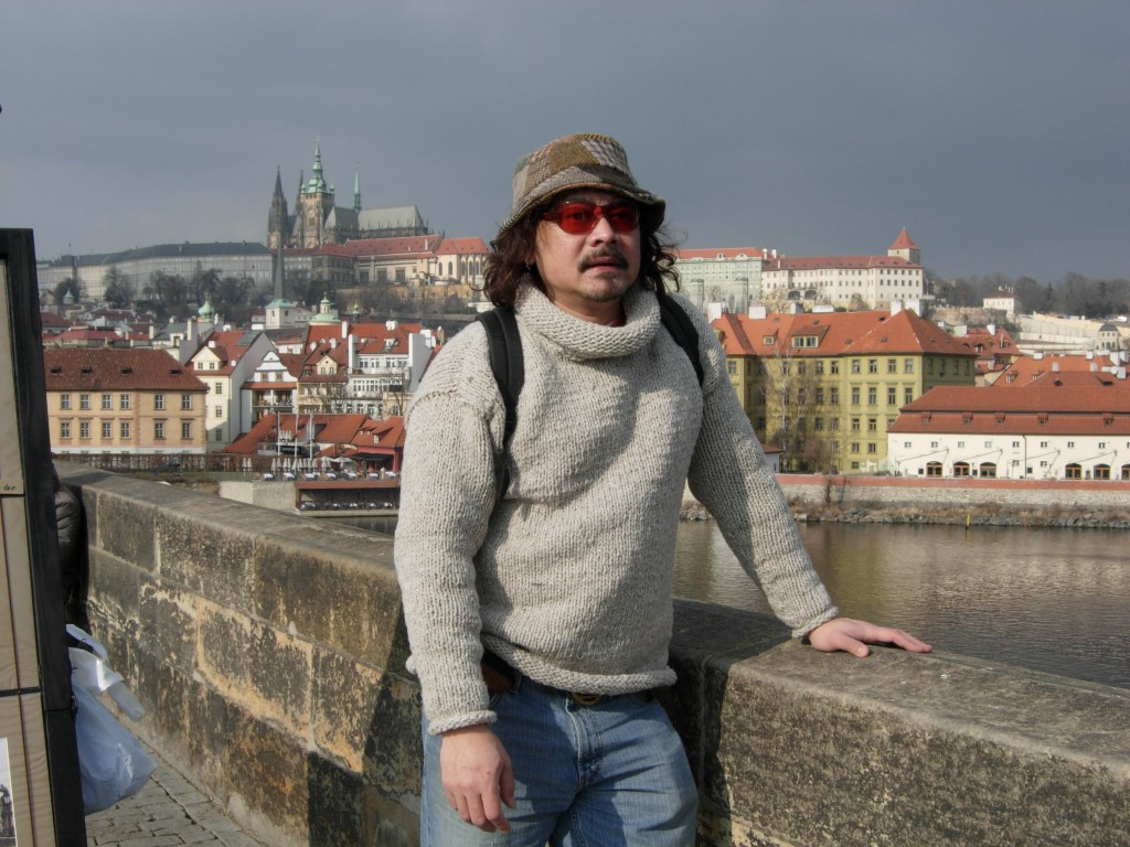 A long time ago, I knitted a sweater for Oat. He wanted a fisherman cable sweater, but he overestimated my knitting skills. He got something more in my realm of technical ability. I got the yarn from a sheep farm shop, Morehouse Farm. I was there for a photo shoot. This was in my distant past when I worked as a book designer. The yarn was squishy and soft. I knitted the sweater in double strands, it was super warm, so he didn’t wear it often. Here’s the sweater on our trip to Prague. It did great with all our walking around the city.