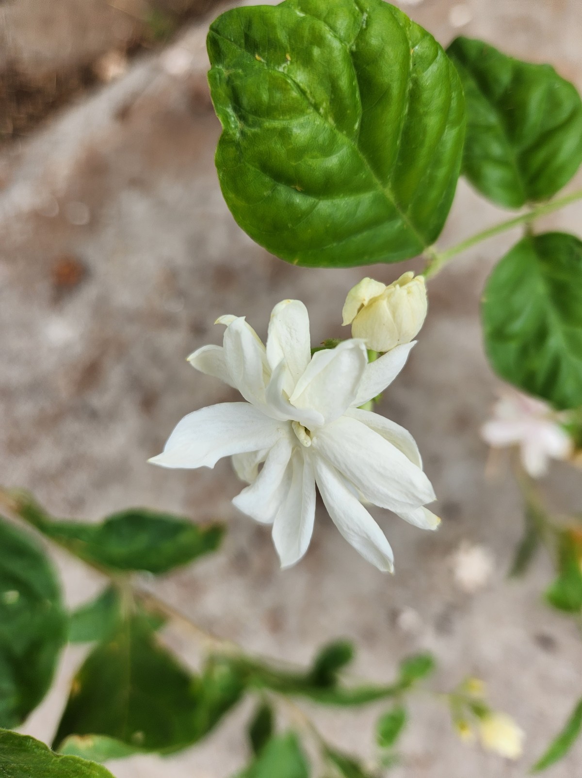 Cora’s pikake is in bloom. Pikake, also known as jasmine, is a drought-resistant plant that grows better in hotter weather. Waipahu is a perfect place for it. This leggy plant shares a pot with gifted papaya from the birds.