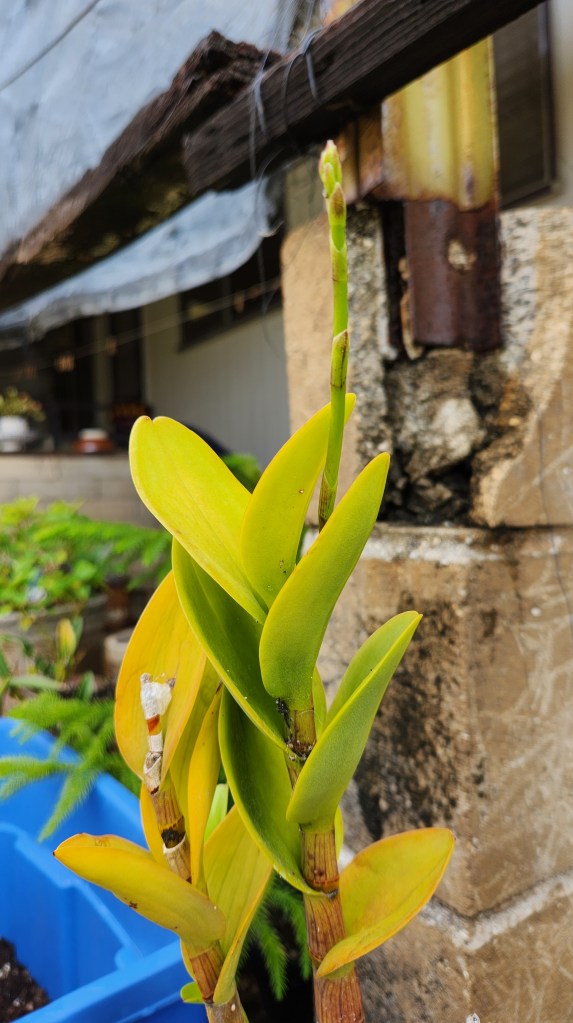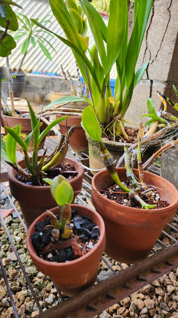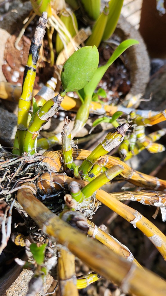 Several of the dendrobiums have keikis (little ones). I read that this happens when the plant is stressed. There is no doubt that several of these plants are stress.