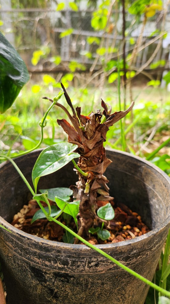 Little leaves and shoots have appeared from these leafless transplants. I knew they had some life left in them as their roots were still green. The bigger green leaves you see in the picture are my pakalana plant which is trying to take over the anthurium patch. I think I transplanted about eight plants. Half of them look like they are starting to come back. As for the other half, I’m waiting to see if something will happen. My Auntie M (the Anthurium Whisper) said to give them time.