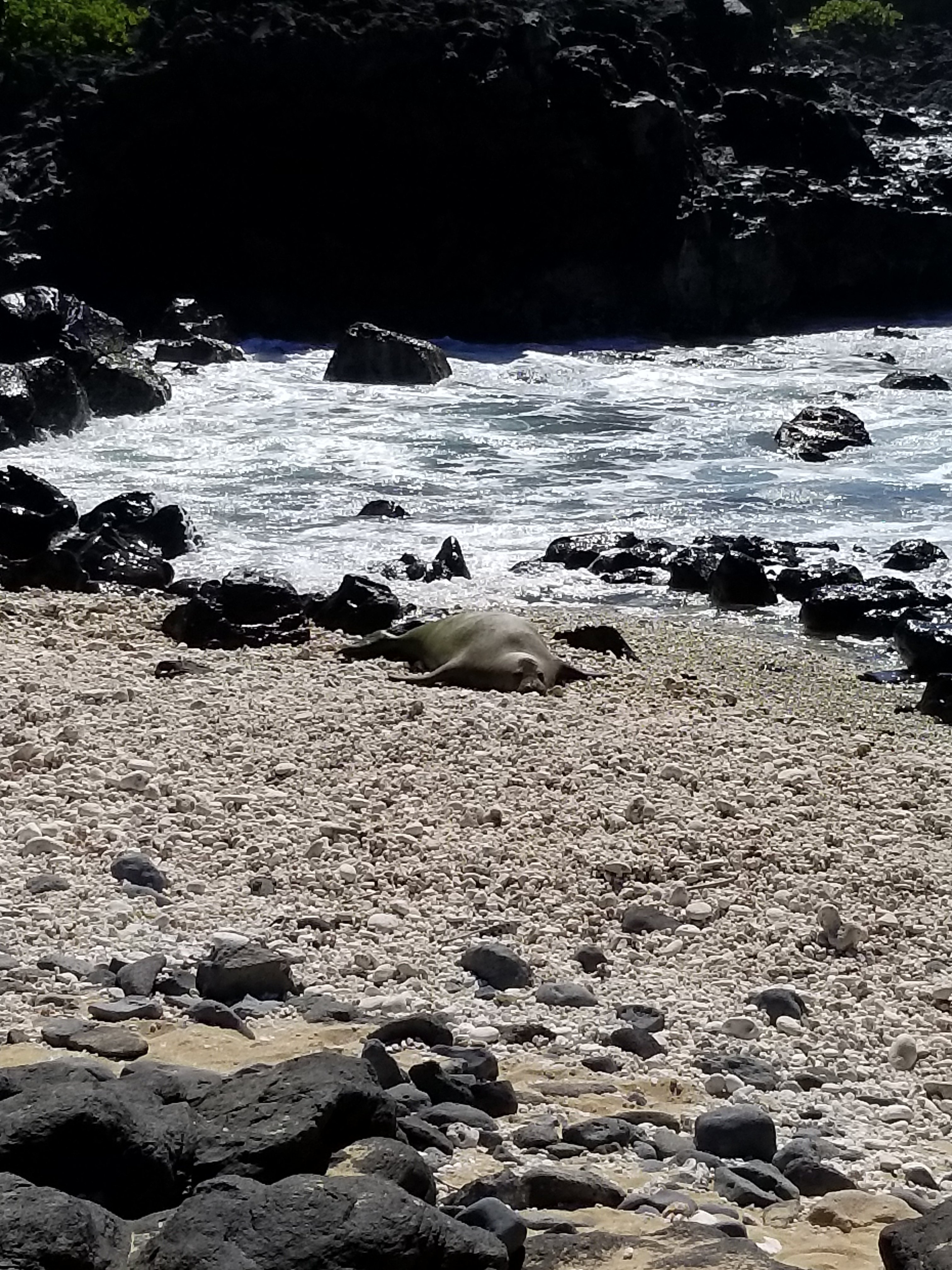 We were trying to be inconspicuous but 4 old people, looking hot and sweating, one with a big blue umbrella, that hope kind of was dashed. There wasn’t a lot of people walking around. In the meantime, we I looked around looking for there right spot, there were monk seals lazying around in the sun.