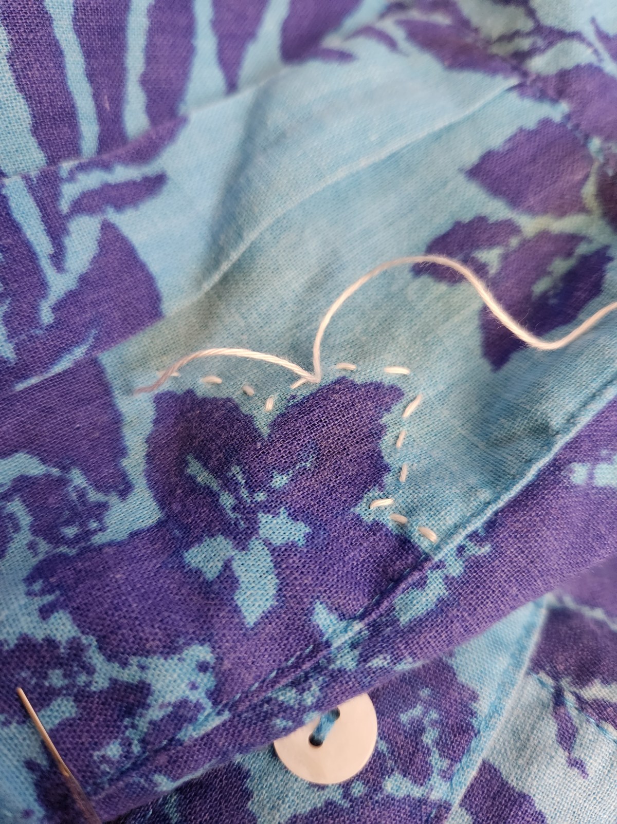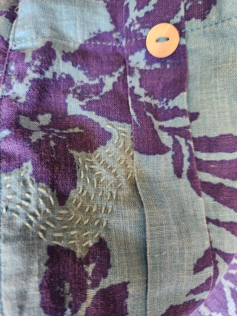 I got this long sleeve aloha shirt from the 2 for a $1 bin. Its only real problem was a brownish stain on the front pocket area. I had an idea about using a running stitch technique in a lighter blue to disguise the staining.