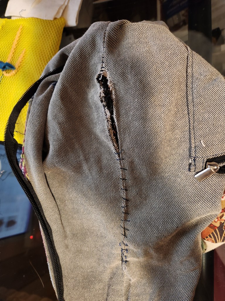 I’ve recently started doing random stitching projects involving upcycling items being tossed out. They still had a lot of life in them. It would be my job to address the staining, broken zipper, hole, or tear to have another round of enjoyment by someone.