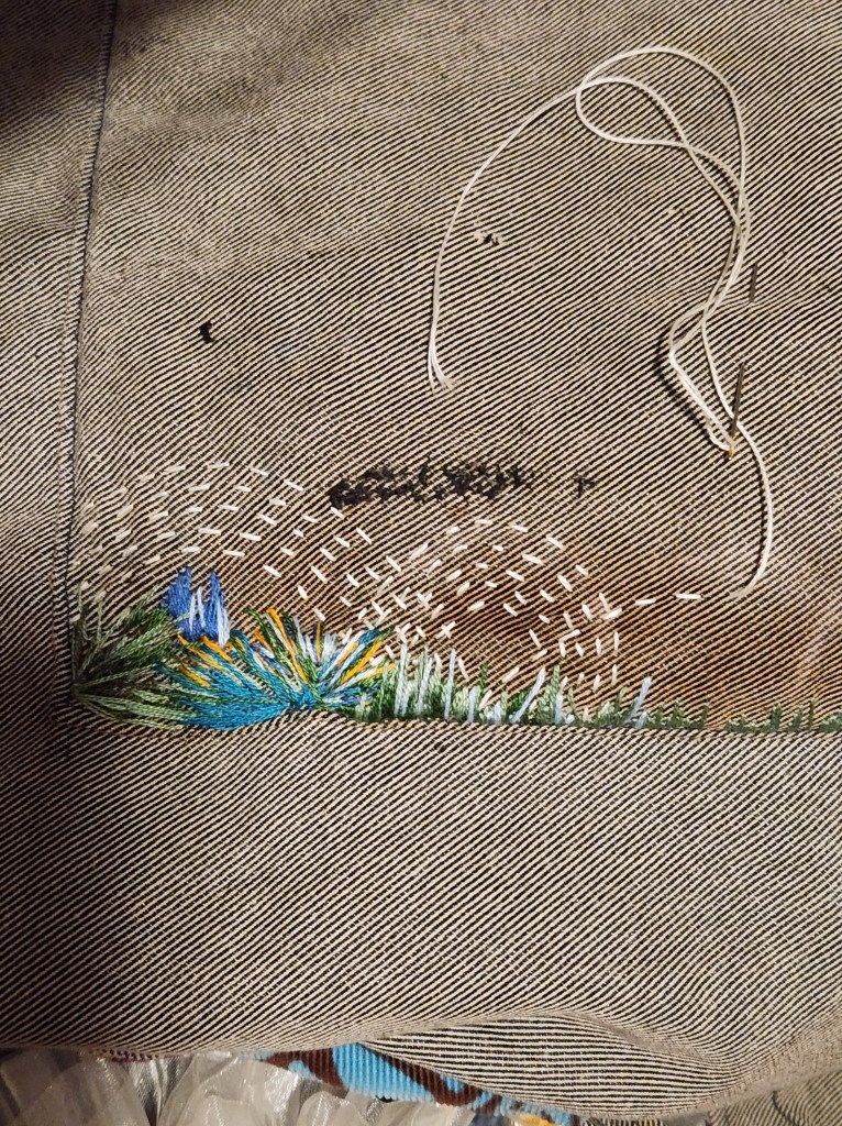I decided to address the staining on the inside pocket. I didn’t have a real plan, but I knew I needed heavier coverage at the bottom, with most of the staining. I don’t know what this stitch is called, but I’ve used it with flowers and grass. I like adding other colors to give it more depth. It is still a work in progress.