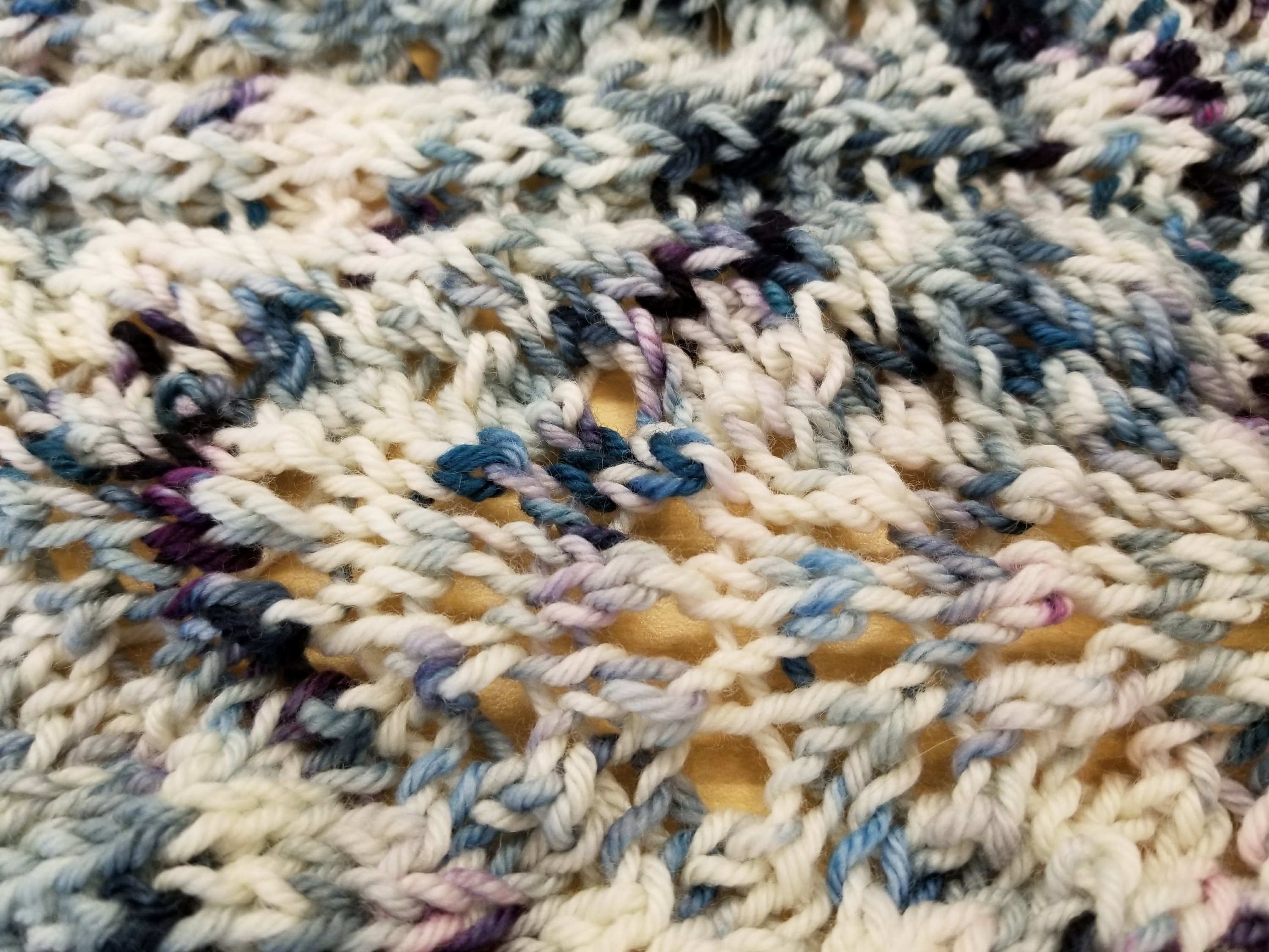I’m trying to let go my love of wool and thought buying a bunch of cotton/linen blends would do the trick. I bought this variegated Bella Lino from Classic Elite. It’s a linen/viscose/cotton blend of blue/green/stone. It’s discontinued and I got it on sale at WEBS.