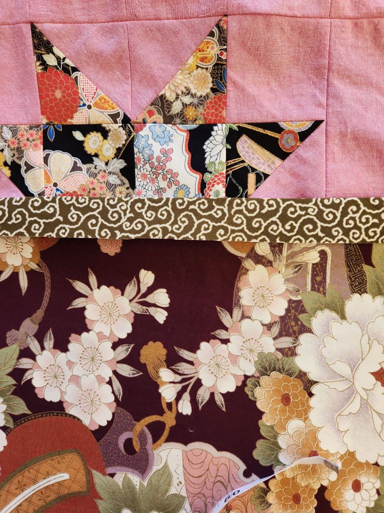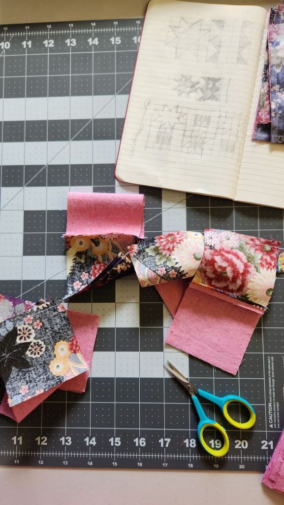 I decided on a square of four prints surrounded by pink. I had the pieces mostly cut, and sewing up the blocks was fast. The layout was easy, as I laid it out in my sketch.