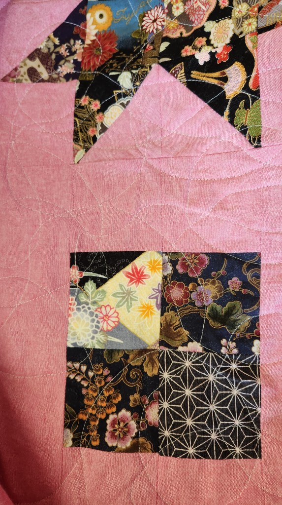 Tah Dah! Here it is. I thought I would have more control of the swirls, but the quilt’s size made a big difference from the test I did. A bit of ripping out and starting over again was involved. It’s been done for a while and has been with its new owner. I hope she likes it or finds someone who does.
