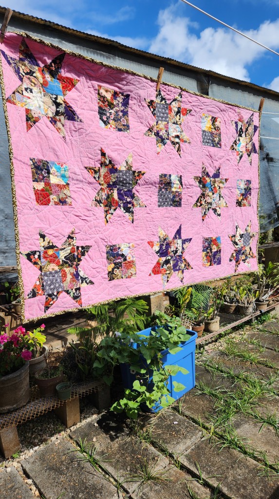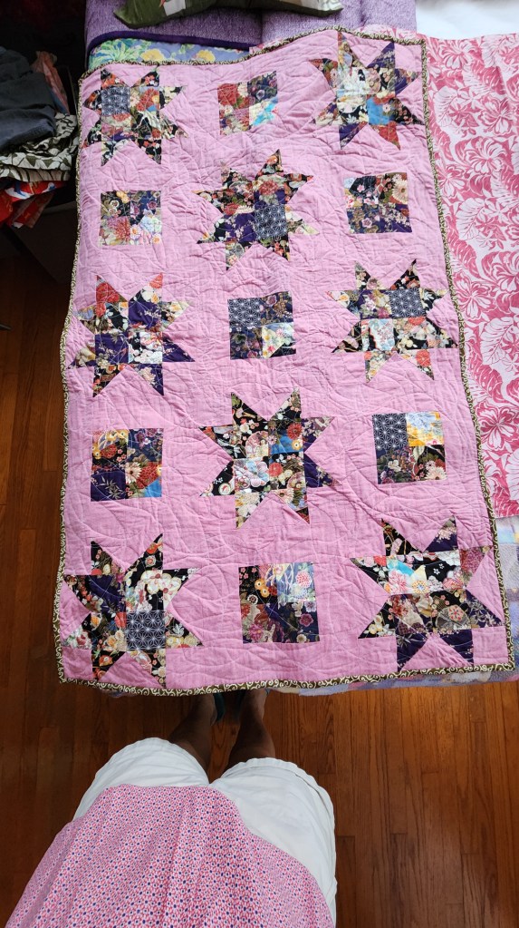 I took on a commission in 2022 to create a quilt with the fabric provided. I could do any pattern, but it needed to be as big as possible. I got stuck for several months after finishing the quilt top. I made no move moment on this quilt. I decided to rework my workroom, which was the key to getting me going again. Now I’m on quilt #7. I got the bug.