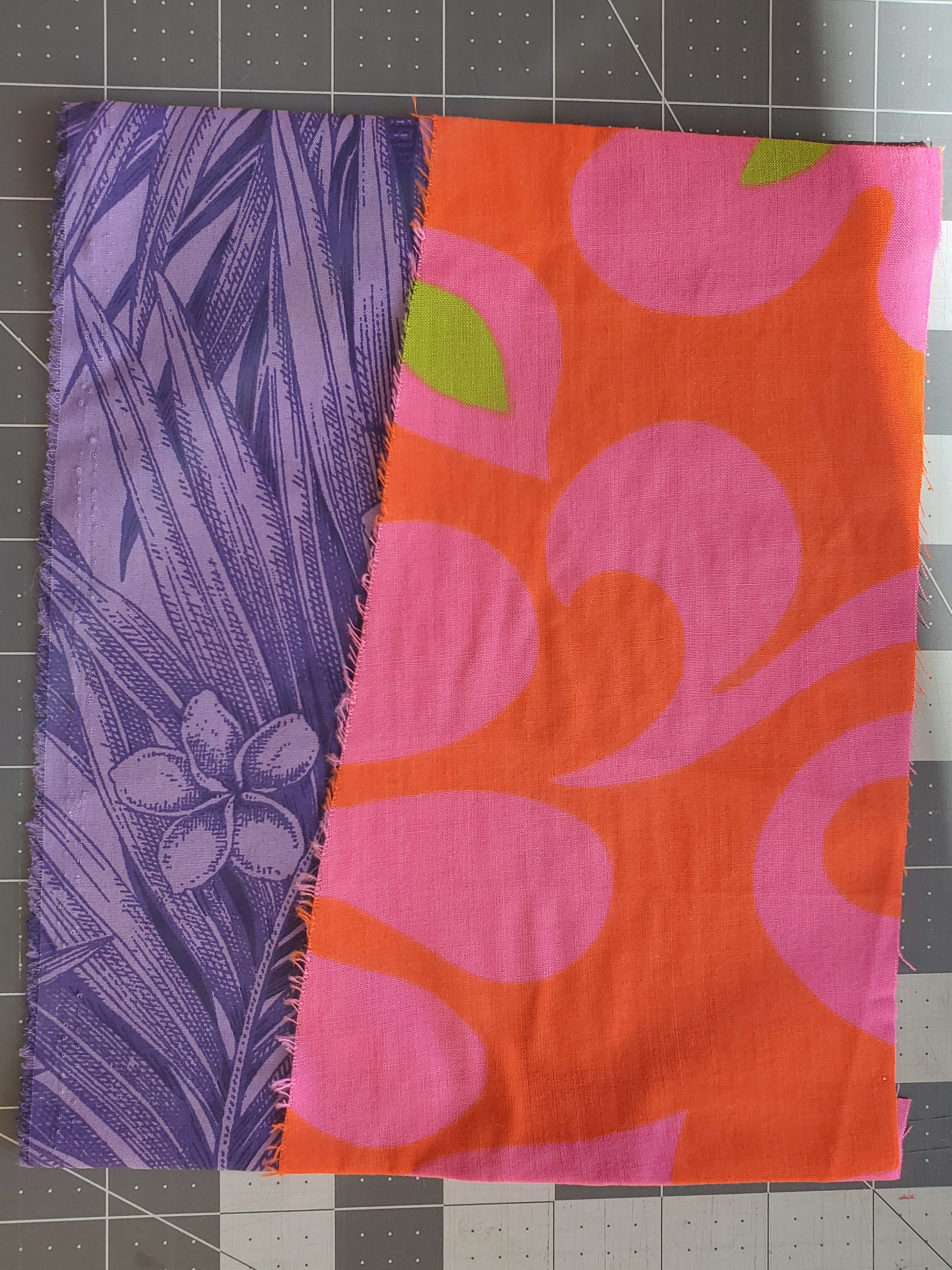 I wanted to make the cover colorful and fun, like the interior. I thought a vintage flower print and purple Hawaiian print would make a great combination. The vintage print was large triangular scraps. That drove the layout of the fabric. I needed to make sure I had enough for all the covers, and I was trying to keep them similar to keep the production time done.