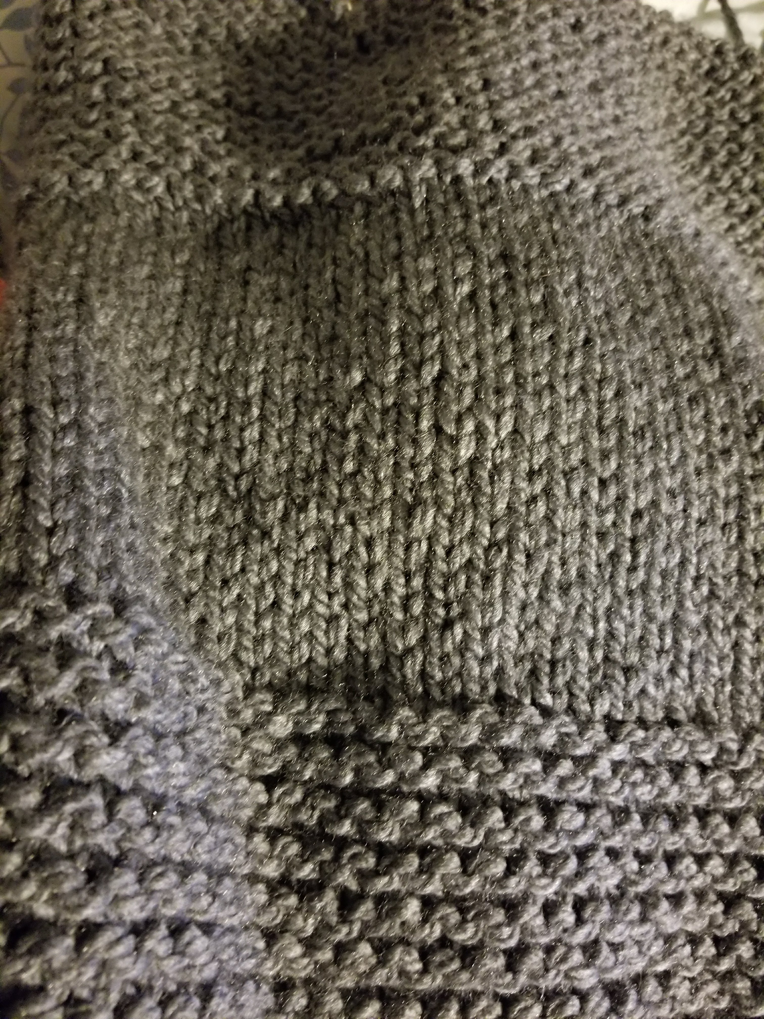 It went quicker than I thought. I bought a Japanese floor chair (no legs, seat cushion with a back) to sit on in front of my monitor to watch my shows as I knitted. It took a little over two weeks to finished. There was a bit of yarn chicken at the end. But I won with about 12″ of yarn to spare.